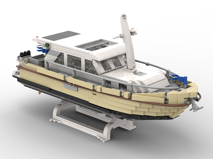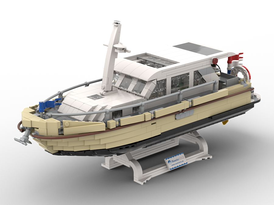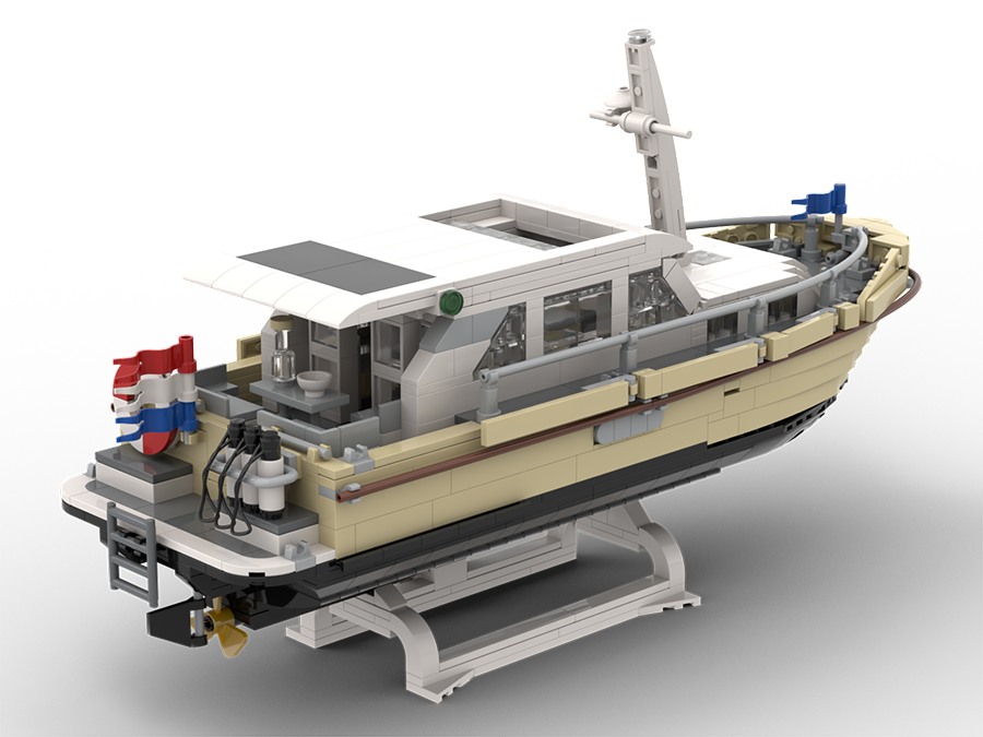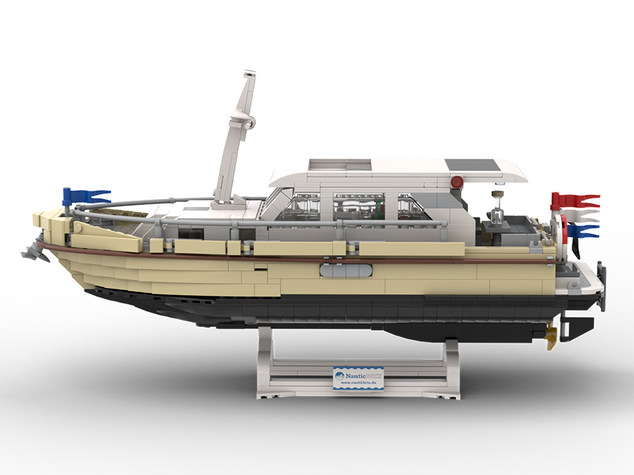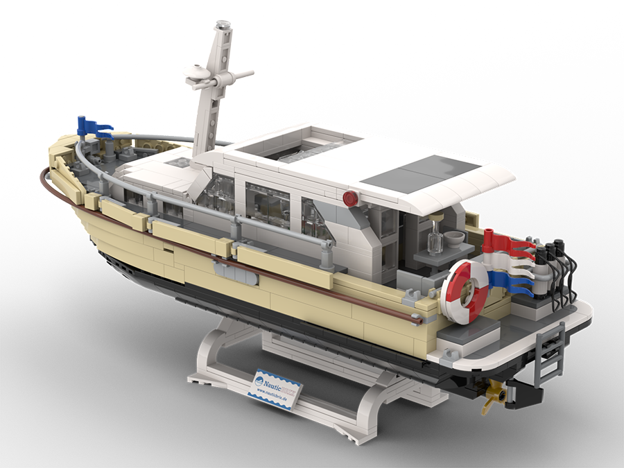 Nautic 35 OC-Sandbeige, Modell einer Motoryacht aus Lego, Ansicht Backbord vorne auf Kompassrose